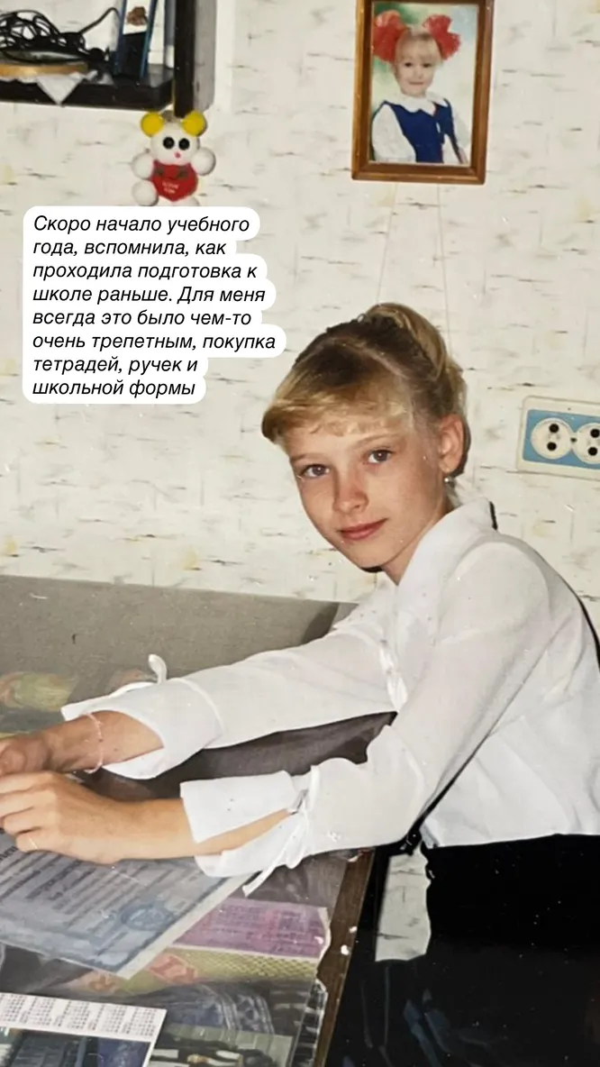 Публикацию архивных фотографий Алена Шишкова сопроводила комментариями о том, что в детстве для нее покупка тетрадей, ручек и школьной формы была особенным событием. На одном из опубликованных снимков юная Алена позировала дома за письменным столом в традиционном школьном наряде. На другом снимке светская львица уже старшеклассница, запечатленная во дворе дома. Она обратила внимание на то, что дочери Алисе перешли по наследству светлые волосы матери и темные глаза отца.