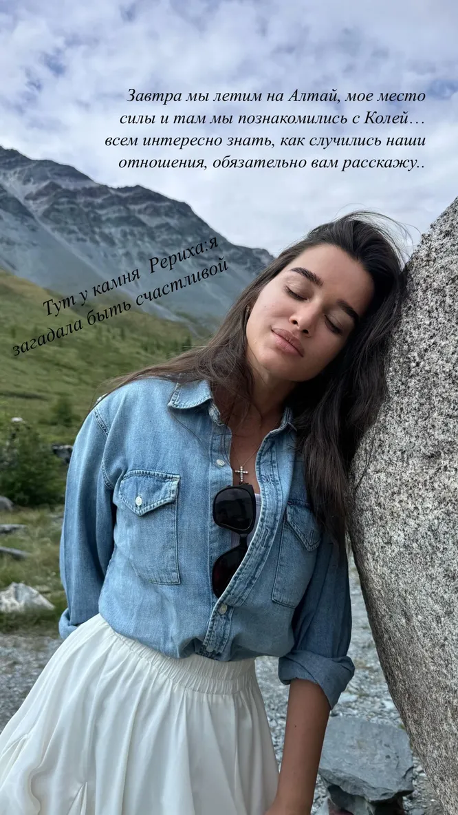 «Летим на Алтай. Для меня это место силы. Именно там мы с Колей впервые познакомились. Там, возле камня Рериха, я загадала желание – стать счастливой», - отметила Бородина.